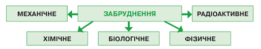 виділити такі види забруднень: хімічне, біологічне, механічне , фізичне забруднення. Зрозуміло, що негативний вплив речовин-забруднювачів, а також випромінювань
